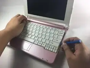 Вставьте синий пластиковый инструмент для открытия в щель между клавиатурой и розовым пластиковым корпусом и нажмите вниз.