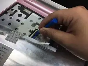 Используя синий пластиковый инструмент для открытия, приподнимите соединитель клавиатуры, чтобы полностью отсоединить клавиатуру от базы ноутбука.