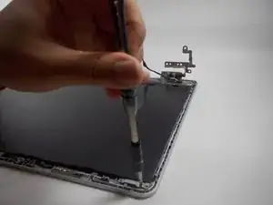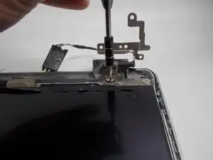 Снимите три винта 6 мм, удерживающие петлю экрана в верхнем правом углу, с помощью отвёртки JIS #0.