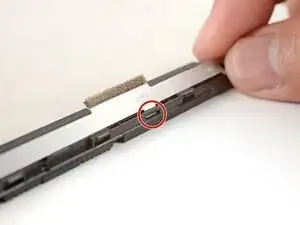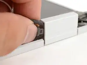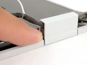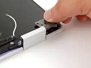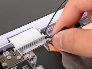 Пальцами подденьте чёрную пластиковую петлю, фиксирующую антенный кабель, рядом с вентиляционными отверстиями у левого шарнира.