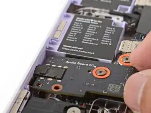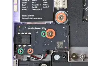 Используйте отвертку Framework, чтобы ослабить удерживаемый винт T5 Torx, крепящий аудиоплату вдоль левого края ноутбука.