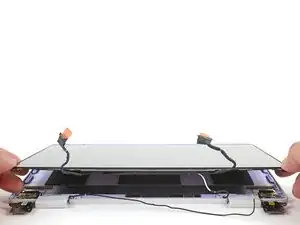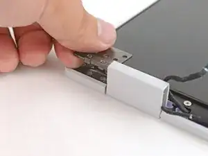 Схватите пальцами оранжевую бирку на кабеле дисплея, расположенную рядом с правой петлёй.