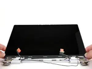 Пальцами возьмите оранжевую вкладку на кабеле дисплея, расположенную рядом с правым шарниром.