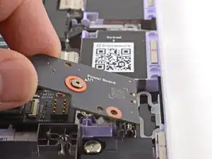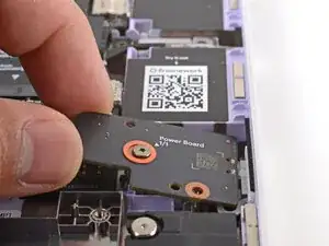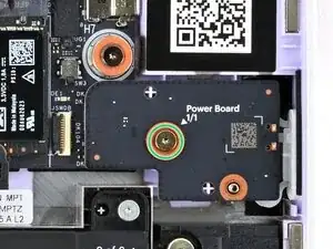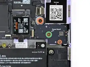 Используйте отвертку Framework, чтобы ослабить удерживаемый винт T5 Torx, крепящий плату кнопки питания (обозначенную «Power Board»).
