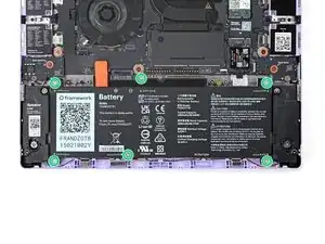 Используйте отвертку Framework, чтобы ослабить шесть удерживаемых винтов T5 Torx, крепящих батарею.