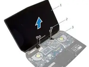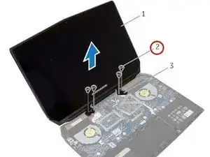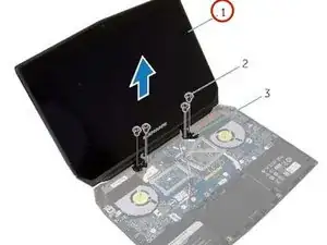 Удалите винты, фиксирующие сборку дисплея к основанию компьютера.
