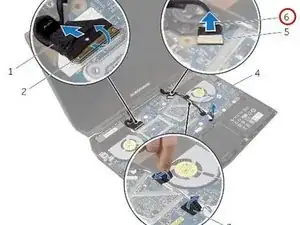 Снимите кабели антенн из направляющих маршрутизации на петлях дисплея.