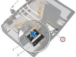 Отклейте кабель тачпада и кабель индикатора состояния от кронштейна клавиатуры.