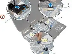 Отключите кабель логотипной платы от системной платы и извлеките его из направляющих маршрутизации на петлях дисплея.