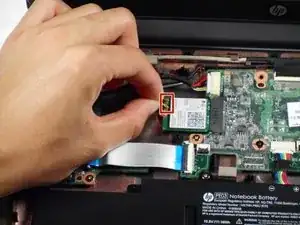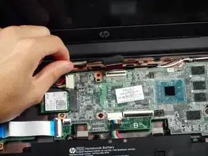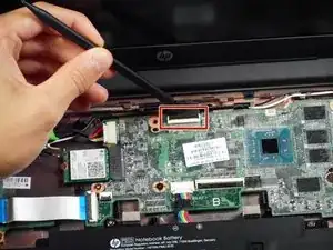 С помощью лопатки поднимите защёлку ZIF, фиксирующую ленточный кабель дисплея в разъёме на материнской плате.