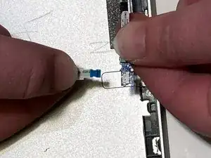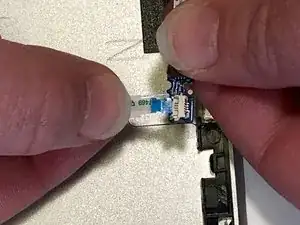 Используя инструмент для поддевания, отогните фиксирующую защёлку, удерживающую разъём тонкого чёрного лентного кабеля внизу материнской платы.