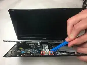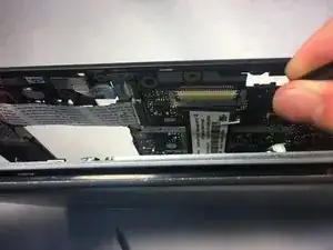 Используйте инструмент для открытия, чтобы отвести защёлки лентового кабеля, всё ещё соединяющего клавиатуру и заднюю панель.