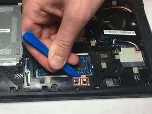 Используйте инструмент для открытия, чтобы оттянуть защёлки ленты кабеля твердотельного накопителя.