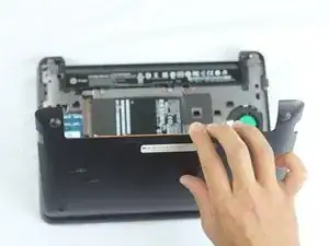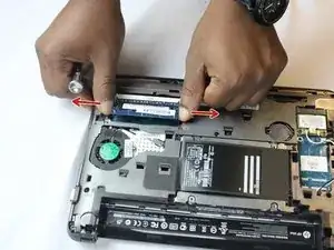 Сдвиньте обе вкладки внутрь, а затем потяните аккумулятор от ноутбука.