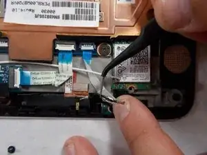 Отсоедините чёрный коаксиальный кабель, подключённый к карте Wi-Fi, с помощью пинцета.