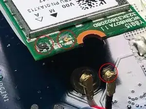 Отключите черный и белый антенныя кабели, прикрепленные к карте, аккуратно вытягивая их с помощью пинцета.