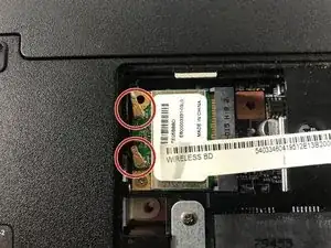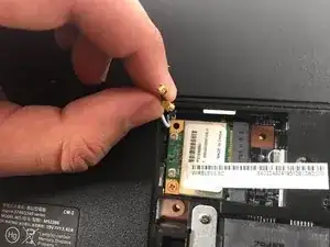 Карта WiFi должна находиться прямо над жестким диском. Отсоедините два коаксиальных разъема, подключенных к карте WiFi, потянув за ними.