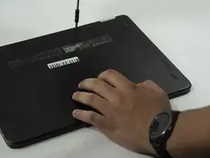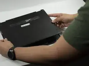 Поверните ноутбук так, чтобы задняя крышка была видна и находилась перед вами. Убедитесь, что он расположен на ровной поверхности, например на столе.