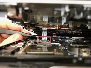 С помощью пинцета отсоедините маленький белый шлейф от разъёма рядом с левой стороной устройства.