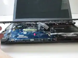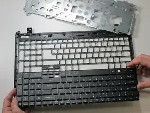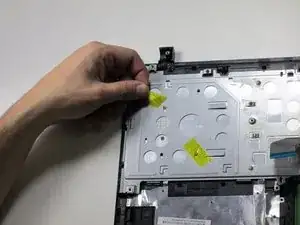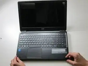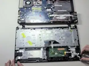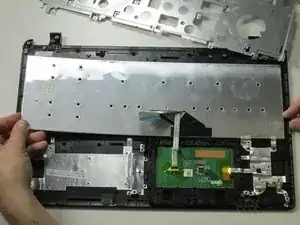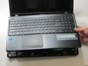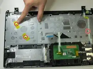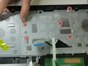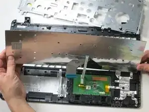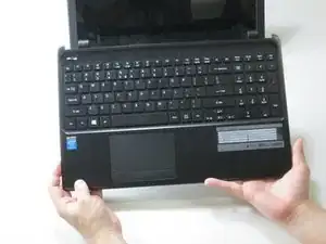 Осторожно отсоедините верхнюю панель ноутбука и медленно поднимите её, чтобы открыть доступ к внутренним компонентам.