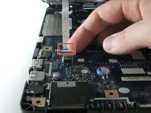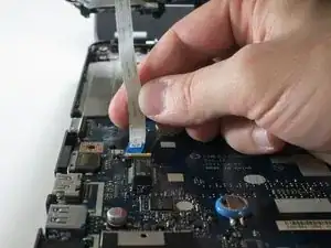 Отсоедините большой шлейф, сдвинув фиксатора назад (в направлении петель), затем аккуратно выньте кабель из разъёма.