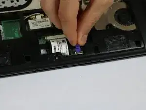 Аккуратно отсоедините разъёмы тачпада, потянув фиолетовые язычки от фиксаторов.