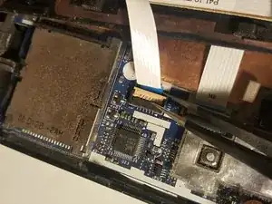 Удалите нижнюю переднюю панель сенсорной панели, используя наклонные пинцеты, чтобы отключить единственный проводной шлейф, соединенный с материнской платой.