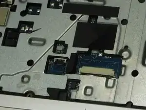 Откройте ноутбук и разместите его на ровной антистатической поверхности. С помощью лопатки (Jimmy) вставьте край инструмента между верхней кромкой клавиатуры и внешней панелью и аккуратно отожмите верхние защёлки. Перед полным снятием клавиатуры аккуратно отсоедините два гибких кабеля, чтобы избежать их повреждения.