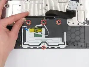 Используйте отвертку JIS №00, чтобы выкрутить четыре винта 0.5 мм, удерживающие трекпад, и отсоединить его от клавиатуры.