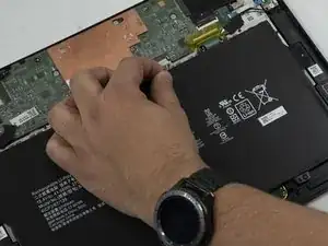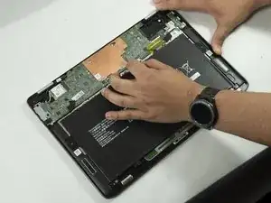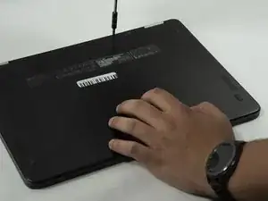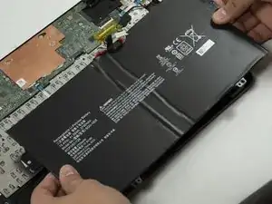 Используйте крестовую отвёртку Phillips #0, чтобы выкрутить последние два крепёжных винта длиной 3 мм на краю корпуса ноутбука, затем аккуратно извлеките аккумулятор.
