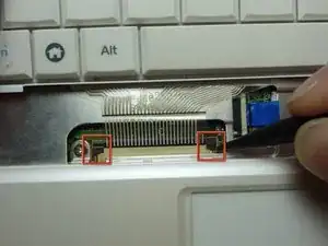 Зажимы удерживают нижнюю часть клавиатуры на ноутбуке. Осторожно поднимите верхнюю часть клавиатуры, а затем переместите всю клавиатуру к экрану компьютера, пока шлейф не станет видимым.