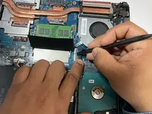 Извлеките кабель из разъема материнской платы с помощью пластиковой лопатки или другого острого предмета и удалите динамики.