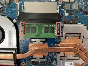 Чтобы снять оперативную память, нажмите на нее вниз и отведите боковые металлические фиксаторы, слегка приподняв их и разведя в стороны.