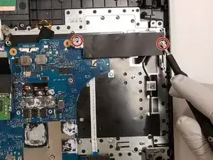Отвёрткой Phillips №0 отвинтите два винта длиной 5 мм, фиксирующих тачпад, расположенных в нижней части тачпада.