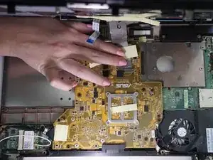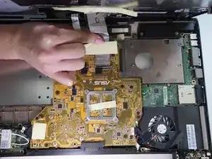 Отогните желтую ленту, соединяющую гибкий металлический плоский кабель с печатной платой.