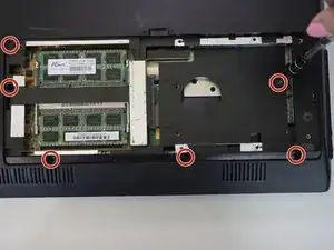 Открутите шесть винтов Philips размером 3 мм в отсеке для оперативной памяти и жесткого диска с помощью отвертки J1.
