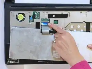Медленно поднимите клавиатуру и при необходимости используйте фонарик, чтобы найти шлейф снизу. Поднимите язык ZIF-разъёма перед тем, как вытащить шлейф.