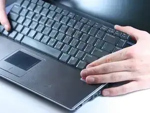 Поднимите клавиатуру с верхней стороны под углом 45 градусов. Уложите ее вверх дном на тачпад.