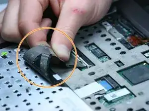 Отсоедините широкий шлейф поперечно от его гнезда на материнской плате, чтобы освободить клавиатуру.