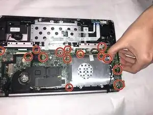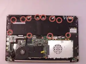 Используйте отвертку Phillips #0, чтобы выкрутить двенадцать винтов 50 мм вокруг батареи.