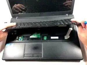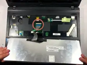 Когда клавиатура освободится, отсоедините шлейф от разъёма с нулевым усилием (ZIF), подняв запорный флажок и вытянув кабель.