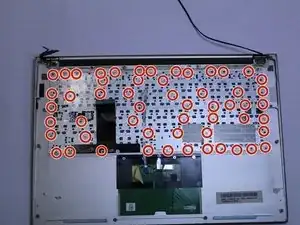 Удалите 56 винтов, отмеченных красными кружками, с помощью отвёртки Phillips #000.