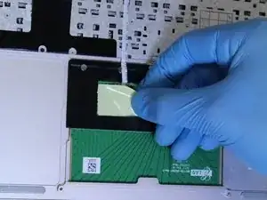 Осторожно отогните жёлтую ленту, чтобы обнажить место подключения ленточного кабеля к тачпаду.