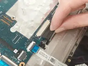 Сдвиньте черные зажимы к аккумулятору, чтобы освободить шлейф. Вытяните шлейф и отключите кабель клавиатуры.