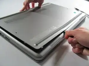 Закройте дисплей. Затем переверните компьютер, чтобы увидеть заднюю крышку.