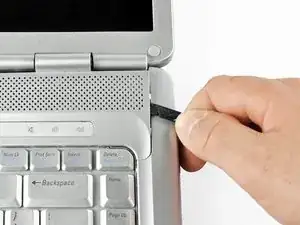 Сдвиньте клавиатуру вбок достаточно, чтобы освободить одну сторону от защелки, затем поднимите клавиатуру от ноут