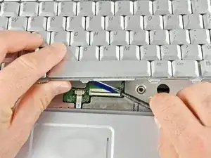Удалите два винта Phillips #1 длиной 5.75 мм, крепящие клавиатуру к ноутбуку.