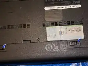 Переверните ноутбук. Удалите батарею, нажав на две вкладки, выделенные синим. Уберите батарею в сторону.