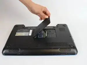 Удерживая левый переключатель в левом положении, вытащите батарею из ноутбука.