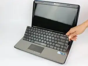Осторожно наклоните клавиатуру вверх и слегка оттяните ее от корпуса ноутбука.